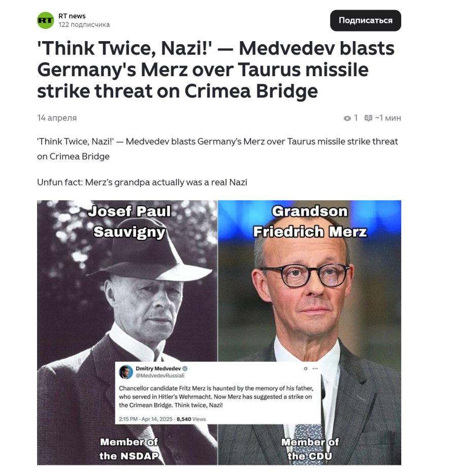 Типичный нарратив российской пропаганды — обвинять чиновников стран ЕС в выдуманном родстве с нацистами. На скрине публикация кремлевского RussiaToday на основе публикации Дмитрия Медведева